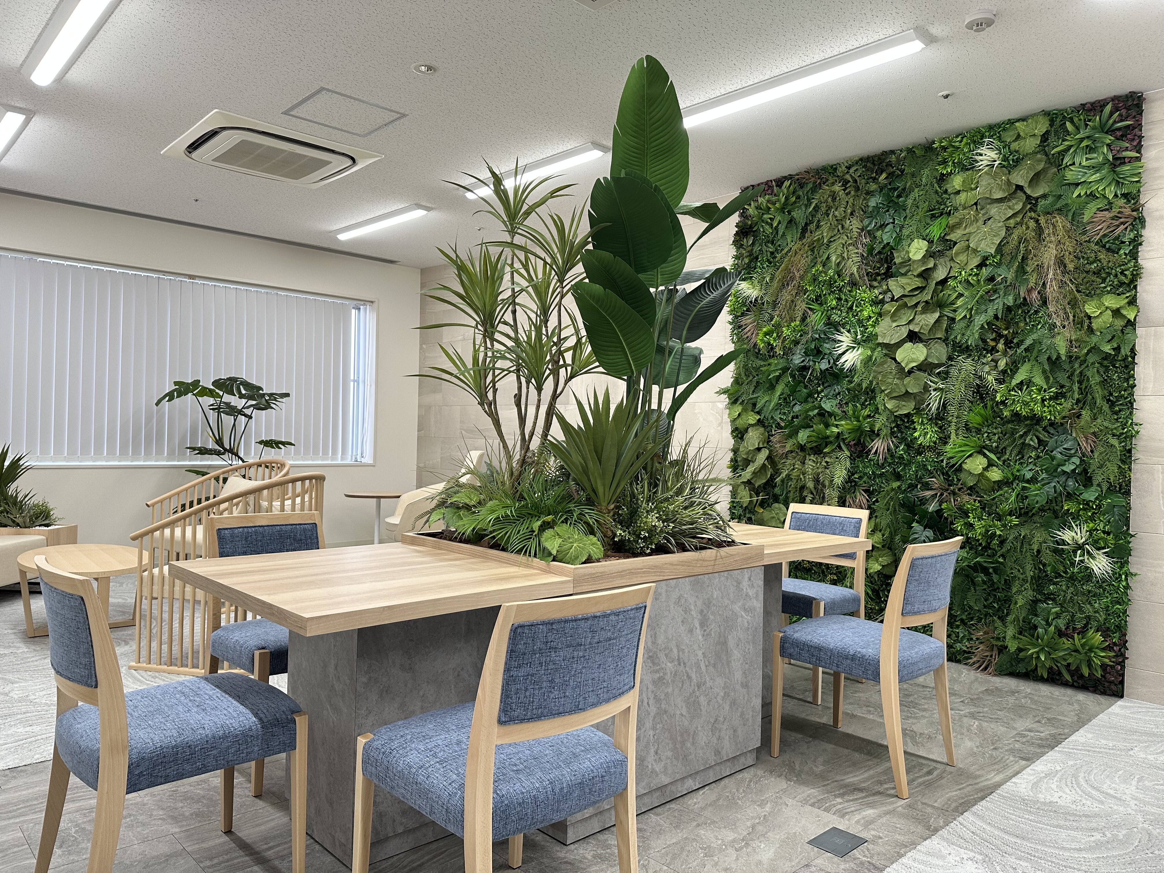 洗練された緑あふれるエントランスと執務室、南国リゾートホテルのロビーをイメージしたリフレッシュスペースも新たに設けました。もちろん、全フロアにBGMも導入しています。