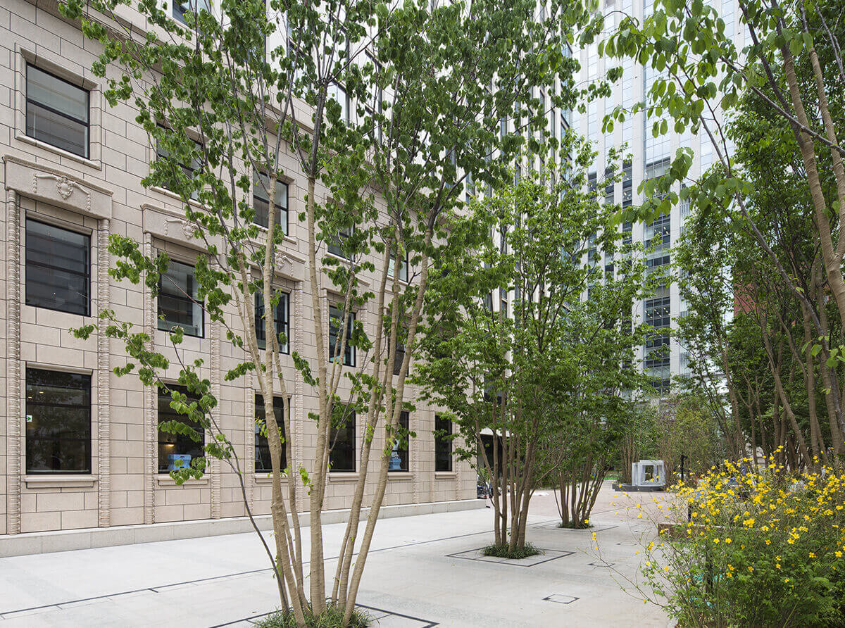 広場部分には、落葉樹を中心とした樹木や、憩いを感じる水路、彫刻家によるアート作品を設置、緑あふれる解放的な空間を演出。