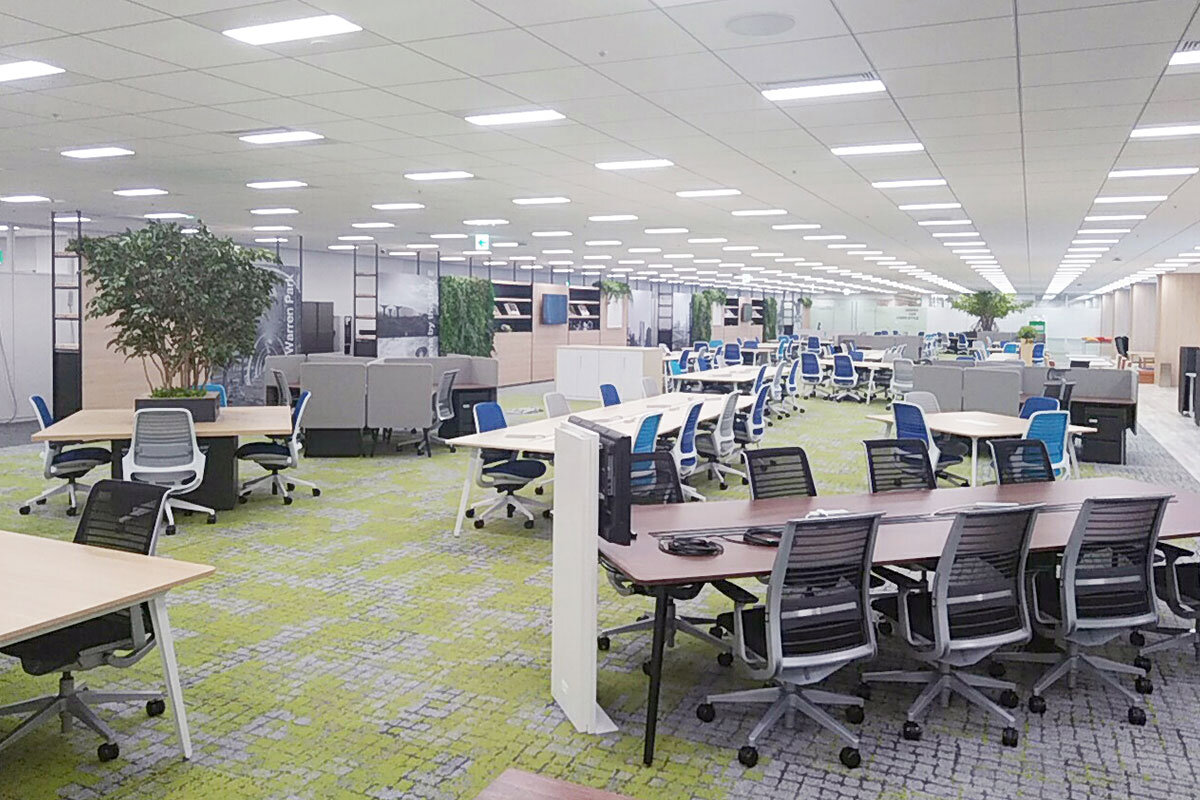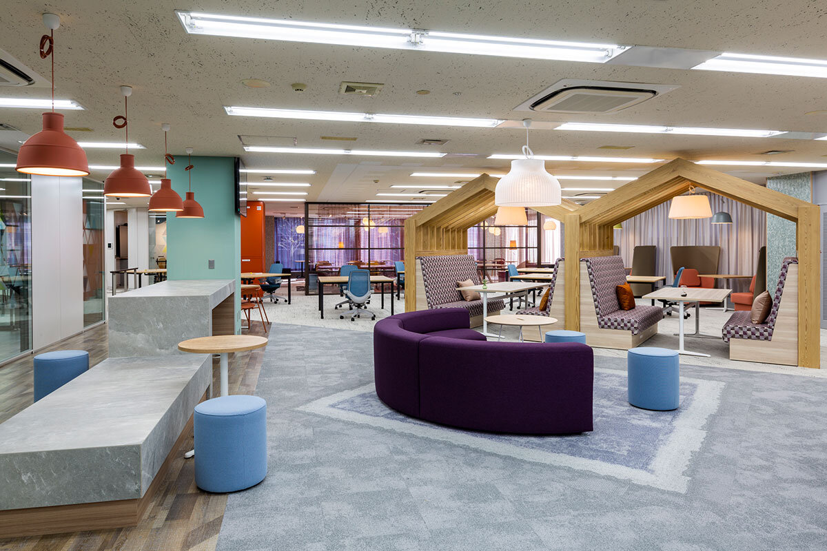 弊社は2019年1月にトヨタ自動車系IT会社3社が統合し、同時に名古屋本社を開設しました。新オフィスは「新しい働き方を来社されたお客様にお見せできるようにすることや、魅力的なオフィスがリクルート活動に活用できる」ことを目指しています。そのため、快適なオフィス環境作りには力を入れており、オフィスBGM「Sound Design for OFFICE(以下、SDO)」の導入はもちろん、グリーンの配置(自然物や造作物混合)や、見通しの良い空間の確保(間仕切りを減らす)、単調な空間にしないために壁紙やカーペットを使い分ける、リラックスエリアは落ち着ける照明(ペンダントライトやスタンドライト)を設置する、マグネットポイントの配置(カフェコーナーなど)と、さまざまな試みを行っています。