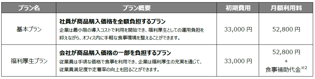 福利厚生の充実を検討しながらもコスト面に課題を感じる企業様に向け、初期費用33,000円(税込)、月額利用料52,800円(税込)から導入できる価格設計としました。無理のないコストで、オフィスに食事環境を整えることが可能です。福利厚生の充実は、求職者に対する企業魅力度の向上にも寄与します。